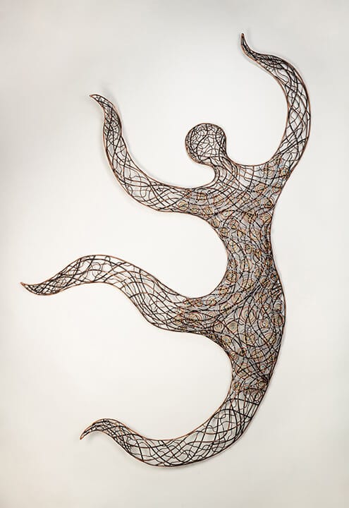 I always wanted to be an “inventor” as a kid. I loved to make things. In my 20s I learned how to fabricate silver jewelry. It never occurred to me that my love of metal-smithing, macramé knotting and basket weaving would turn into a unique form of metal sculpture. I work mainly with recycled wire to build 3–d sculpture or wall art. An oxy-acetylene torch allows me to anneal wire of various gauges softening it enough to use a combination of weaving techniques to make a metal cloth. With the help of hand tools and imagination, the metal cloth is then brazed or fused to create organic structures and form. Acid patinas and metallic paints color my work.